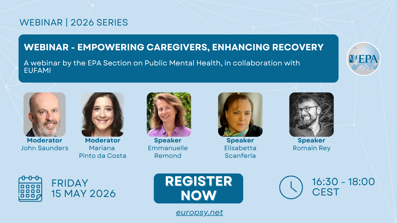For International Day of Families, the EPA is pleased to announce the webinar “Empowering Caregivers, Enhancing Recovery”, taking place on Friday, 15 May 2026, from 16:30 to 18:00 CEST. This webinar is organised by the EPA Scientific Section on Public Mental Health and European Federation of Associations of Families of People with Mental Illness (EUFAMI).