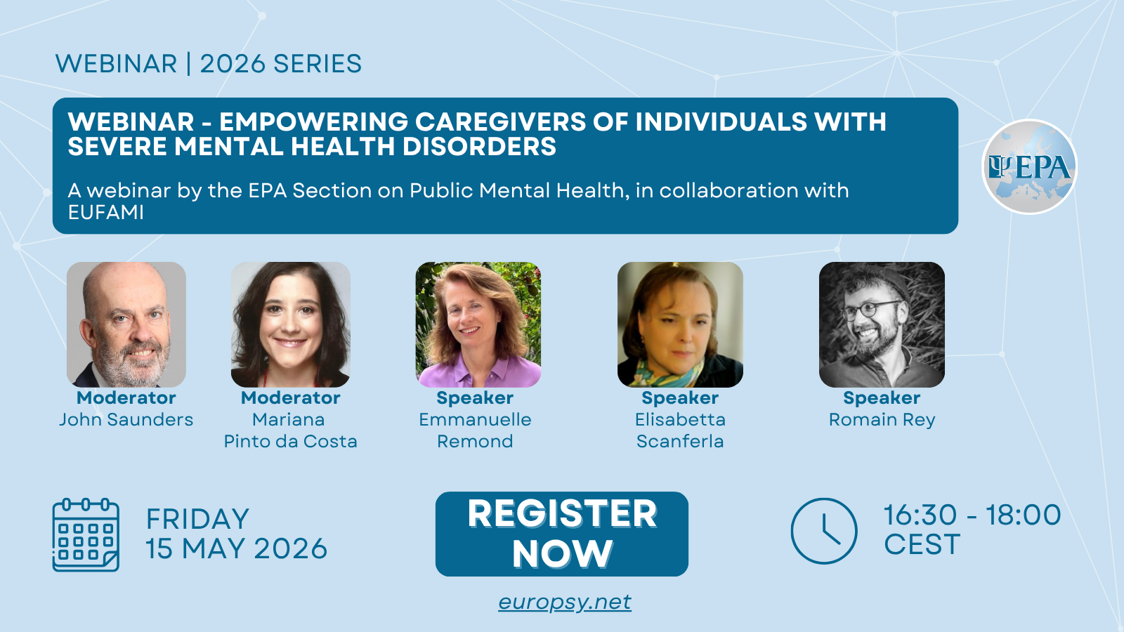 For International Day of Families, the EPA is pleased to announce the webinar “Empowering Caregivers of Individuals with Severe Mental Health Disorders”, taking place on Friday, 15 May 2026, from 16:30 to 18:00 CEST. This webinar is organised by the EPA Scientific Section on Public Mental Health and European Federation of Associations of Families of People with Mental Illness (EUFAMI).