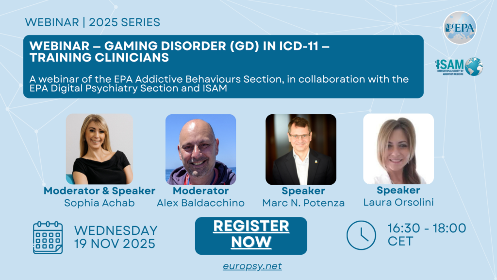 The EPA is pleased to announce the webinar “Gaming Disorder (GD) in ICD-11- Training clinicians”, taking place on Wednesday, 19 November 2025, from 16:30 to 18:00 CET. This webinar is organised by the EPA Addictive Behaviours Section, in collaboration with the EPA Digital Psychiatry Section and the International Society of Addiction Medicine (ISAM).